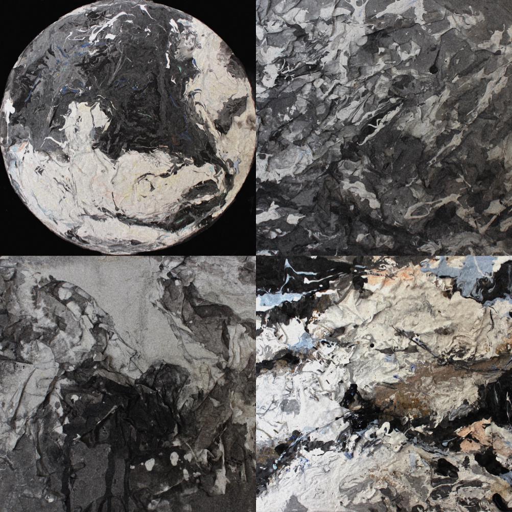 材料作品技法说明:材料上主是要木板,亚麻布,白乳胶,腻子粉,国画墨,水粉颜料,但是是以剪纸为主要核心,以纸折裁出各种形状相互拼合,组成我想要达到的形状。但前期我以腻子,颜料,国画水墨画出大背景,之后在粘合纸张表现形状,之后再主观处理,用水粉颜料添加氛围,达到不同的视觉体验。