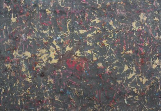 材料作品技法说明:材料上主使用了木板,亚麻布,白乳胶,水粉颜料,螺钿,宣纸和环氧树脂。首先将水粉颜料按照一定比例稀释后泼撒在宣纸上,再将泼出的图形重新裁剪、组合拼贴,最后用环氧树脂封层。