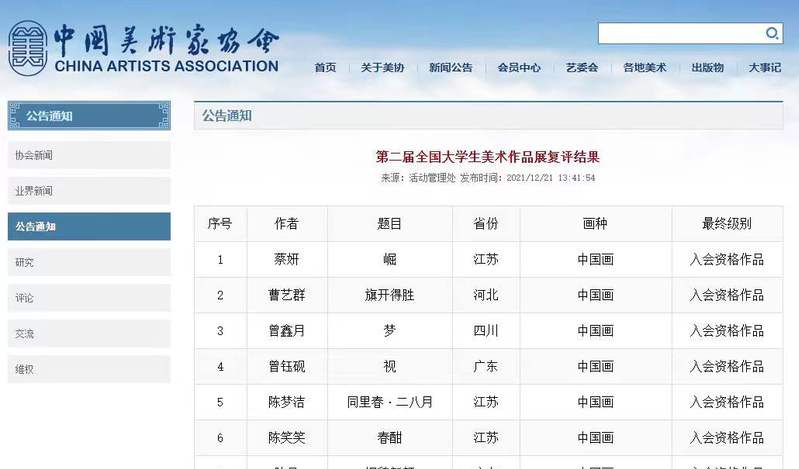 12月21日下午,中国美术家协会官网公布《第二届全国大学生美术作品展》复评名单,我系(校美术设计系)19级油画2班学生焦同旭综合材料绘画作品《墨阵》成功入选,同时获得一次“入会资格”。这是本校学生第一次入选国家级美术作品展。