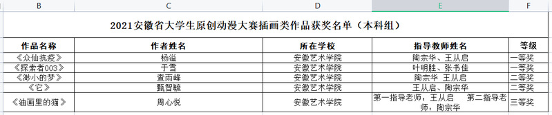 据悉,2021安徽省原创动漫大赛由安徽省教育厅主办,安徽工程大学承办。大赛举办以来,受到安徽省众多高校师生的广泛关注和热情参与,有效参赛作品达1640件。(撰稿:甄智毓 初审:王亚鹏 复审:李卫国 终审:罗耀东)