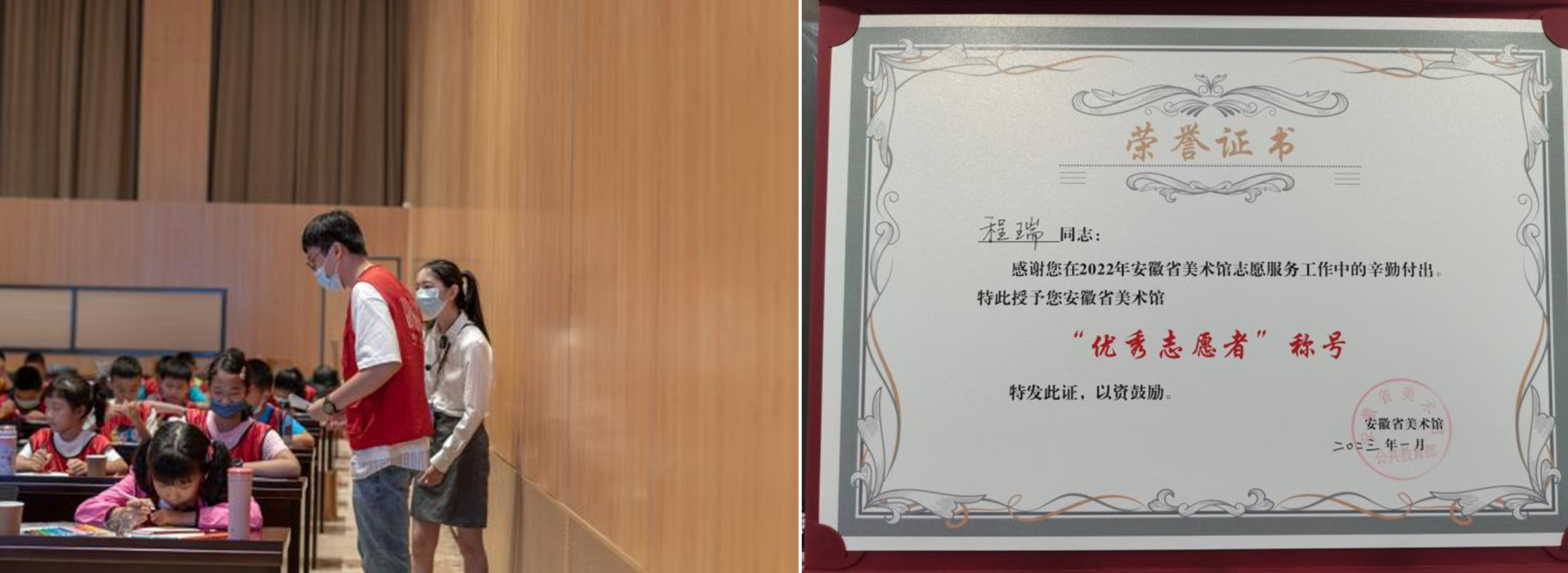 2022年5月,伴随着安徽省美术馆的正式开放,为广大群众带来了丰富的艺术展演活动,我校师生也多次前往省美术馆游览、研学以及线上直播授课。其中,我校美术学院学生支部的积极分子程瑞(20级绘画本科)同学,作为美术馆皖美·志愿服务队中的一员,活跃在安徽省美术馆的各大展厅和活动现场,负责活动现场的拍摄工作,捕捉着一个个精彩的瞬间,不忘初心,践行无私奉献精神,展示着志愿者的风采,并荣获安徽省美术馆优秀志愿者称号。