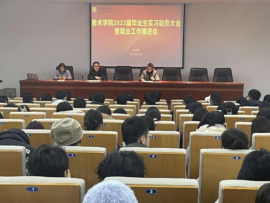 2月24日上午,美术学院在美术楼一楼报告厅召开2023届毕业生实习动员大会暨就业工作推进会,学院党总支书记陈明海、副书记李卫国、副院长李李、办公室、教科研办、学管办以及毕业班辅导员和全体在校毕业生参加了会议。