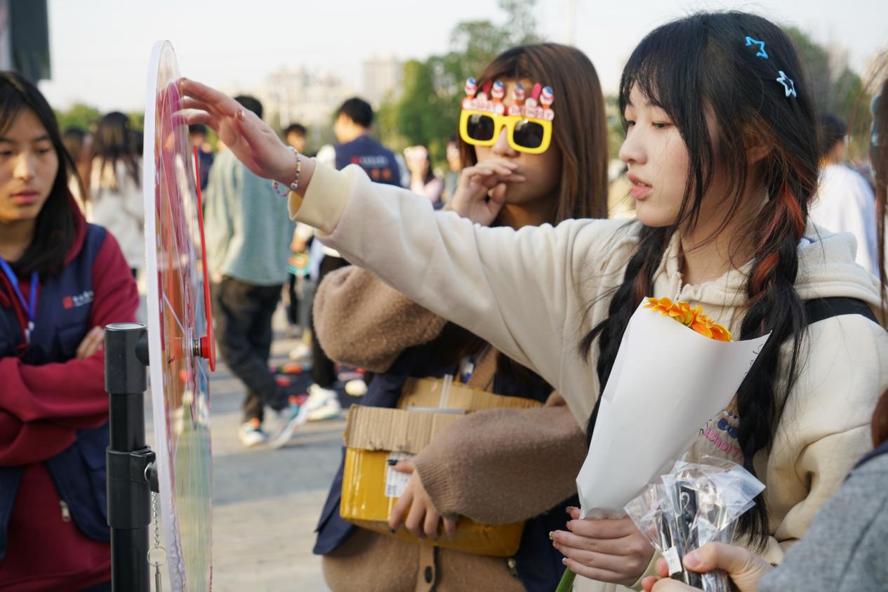 活动开始前,志愿者们先将同学精心挑选的花朵用淡粉色花纸包裹好,再系上蝴蝶结丝带。活动内容丰富,形式多样,送花束、套圈有利、幸运大转盘、爱的便利贴游戏等深受学生欢迎,特别在放学“高峰”包花束环节,更是吸引了很多学生的目光,大家纷纷参与其中,将活动氛围推向高潮,导致花束点来不及剪丝带,套圈处尽是志愿者弯腰捡圈的场景。现场欢声笑语此起彼伏、热闹非凡。