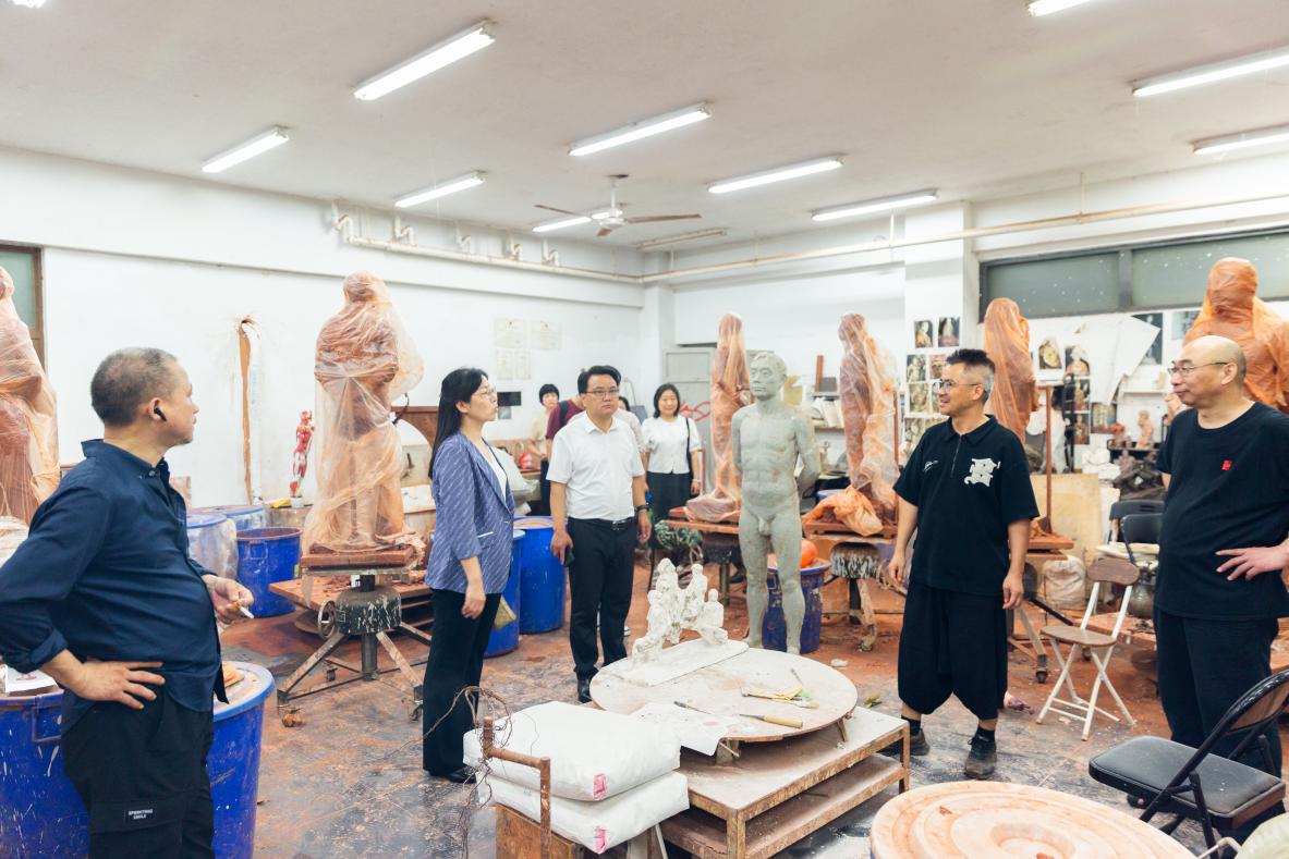 在南艺美院党总支书记巢乃鹓等人的陪同下,一行人先后参观了南京艺术学院美术学院档案室、图书馆、中国画、油画、版画、雕塑等教室、工作室、试验室;对各专业教学环境、教学设备、实训室设备使用、维护情况等展开调研。随后在学院会议室展开座谈交流会。