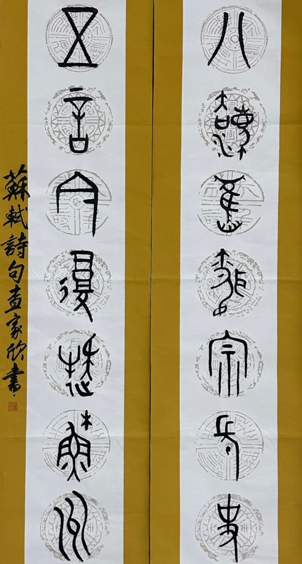 查家欣 《四尺对联金文<答王定民>诗句》 138cm×34cm×2