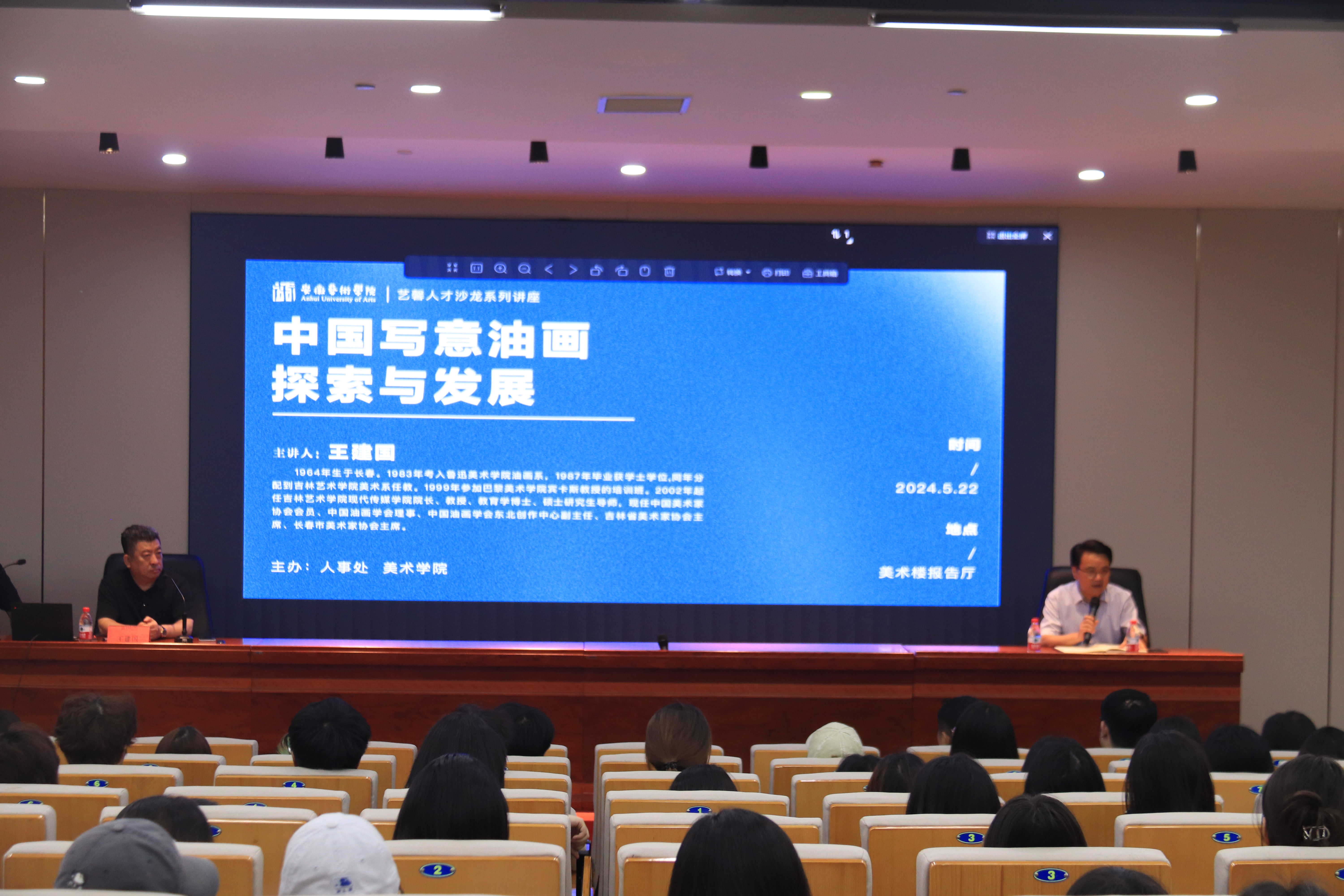 5月22日,在乐动网官网美术楼举行了吉林省美术家协会主席、东北师范大学博士生导师王建国教授任乐动网官网油画研究院院长的受聘仪式暨 “中国写意油画探索与发展”主题讲座。美术学院党总支书记陈明海主持。