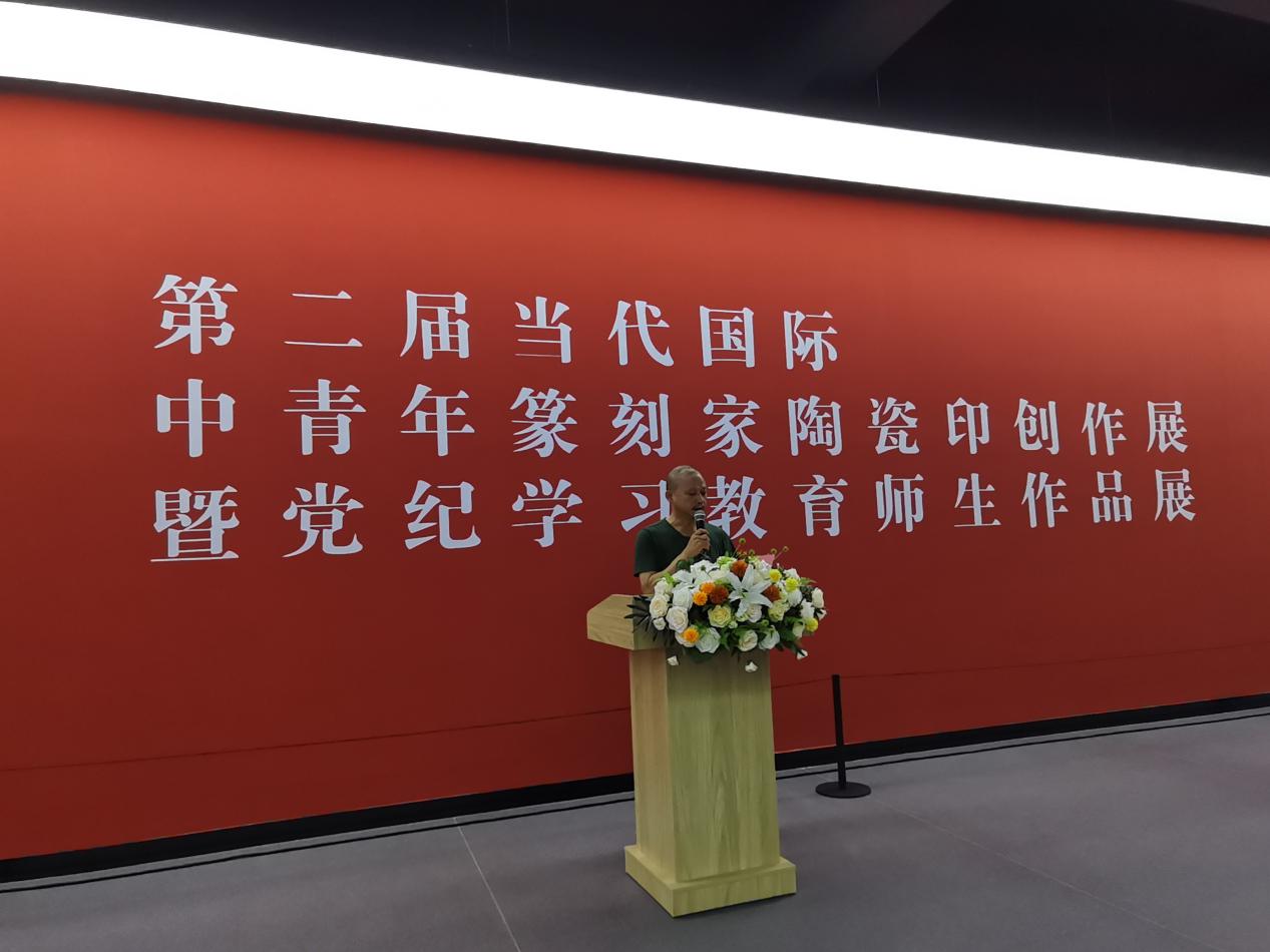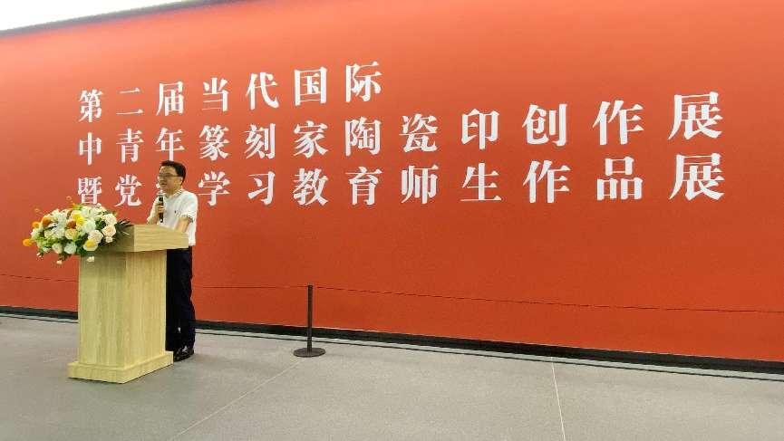 6月14日上午,第二届当代国际中青年篆刻家陶瓷印创作展暨党纪学习教育师生作品展在资城科创艺术中心隆重开幕。美术学院院长束薪水主持,党总支书记陈明海致词。