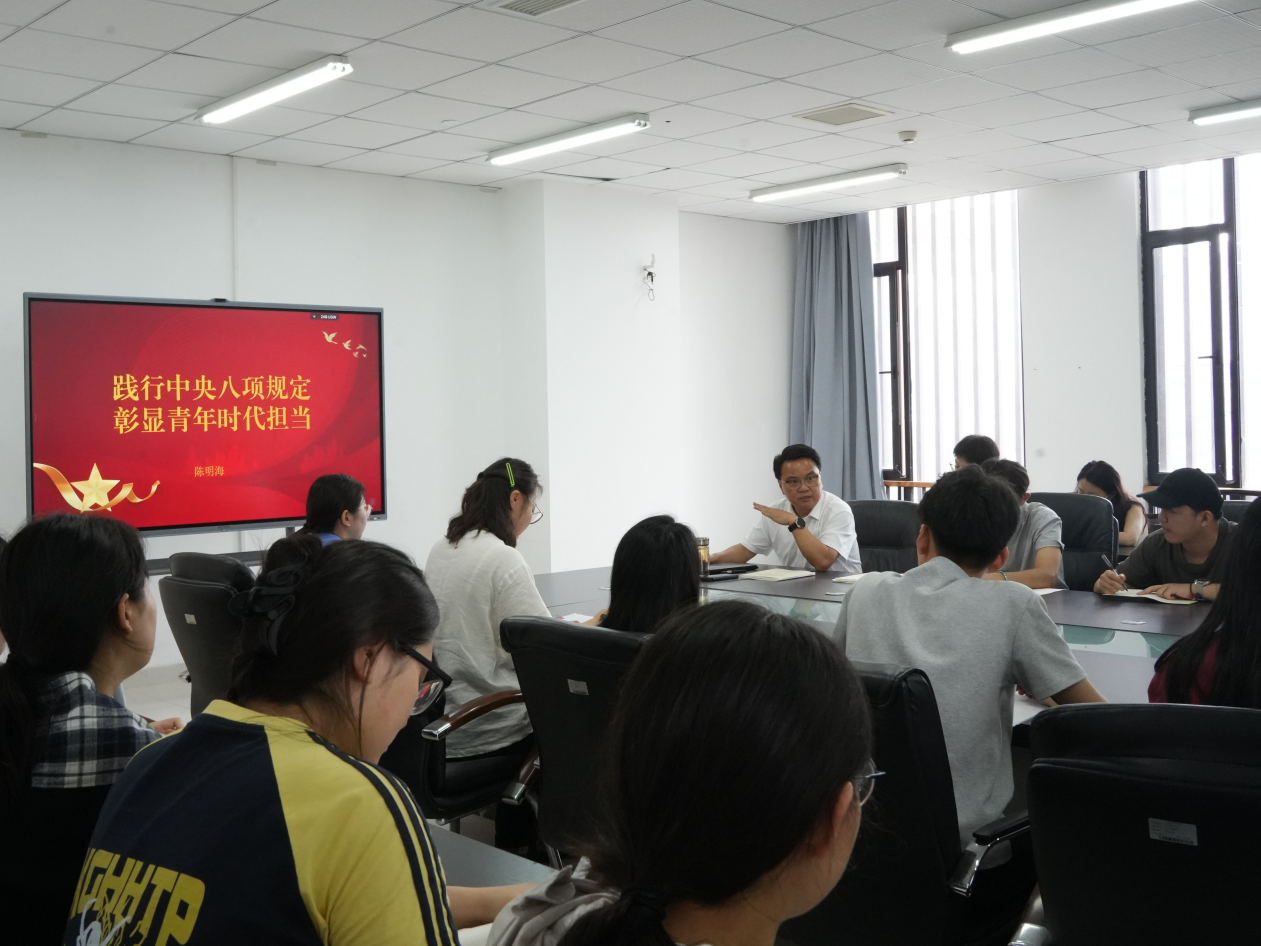 陈明海分别从五个维度展开系统讲解,首先结合党的十八大以来全面从严治党新形势的时代背景,阐释八项规定的历史意义;逐条解读改进调查研究、精简会议活动等八项规定的具体要求与核心内涵;通过教育系统违反中央八项规定精神典型案例的“活教材”开展警示教育;强调新时代青年党员要扣好廉洁从政的“第一粒扣子”,自觉担起责任,在服务师生、社会实践中学以致用,确保学习教育转化为发展成效。
