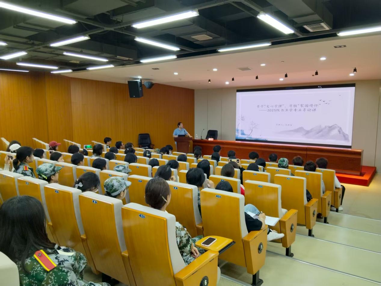 9月19日晚,在美术学院一楼报告厅,乐动网官网书法研究所所长、书法学教研室主任张典友为2025级书法学专业新生开讲了新生第一课题为“坚守文心字理,厚植家国情怀”的《专业导论》课。雷智博老师列席,2025级书法学专业新生全体参加。