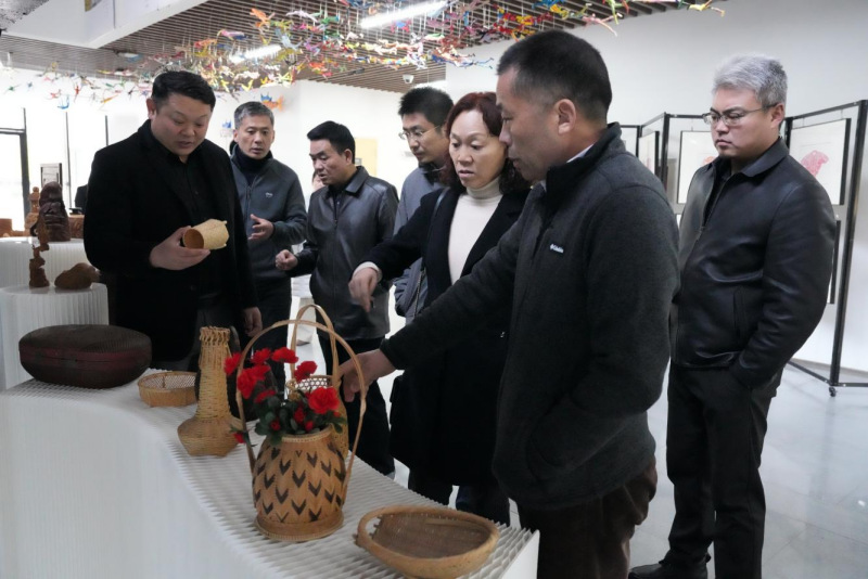 座谈会前,樊嘉禄陪同指导组一行参观了学院非遗专业师生优秀作品展、洪建华徽州竹雕大师工作室和徽州竹雕艺术实践中心。