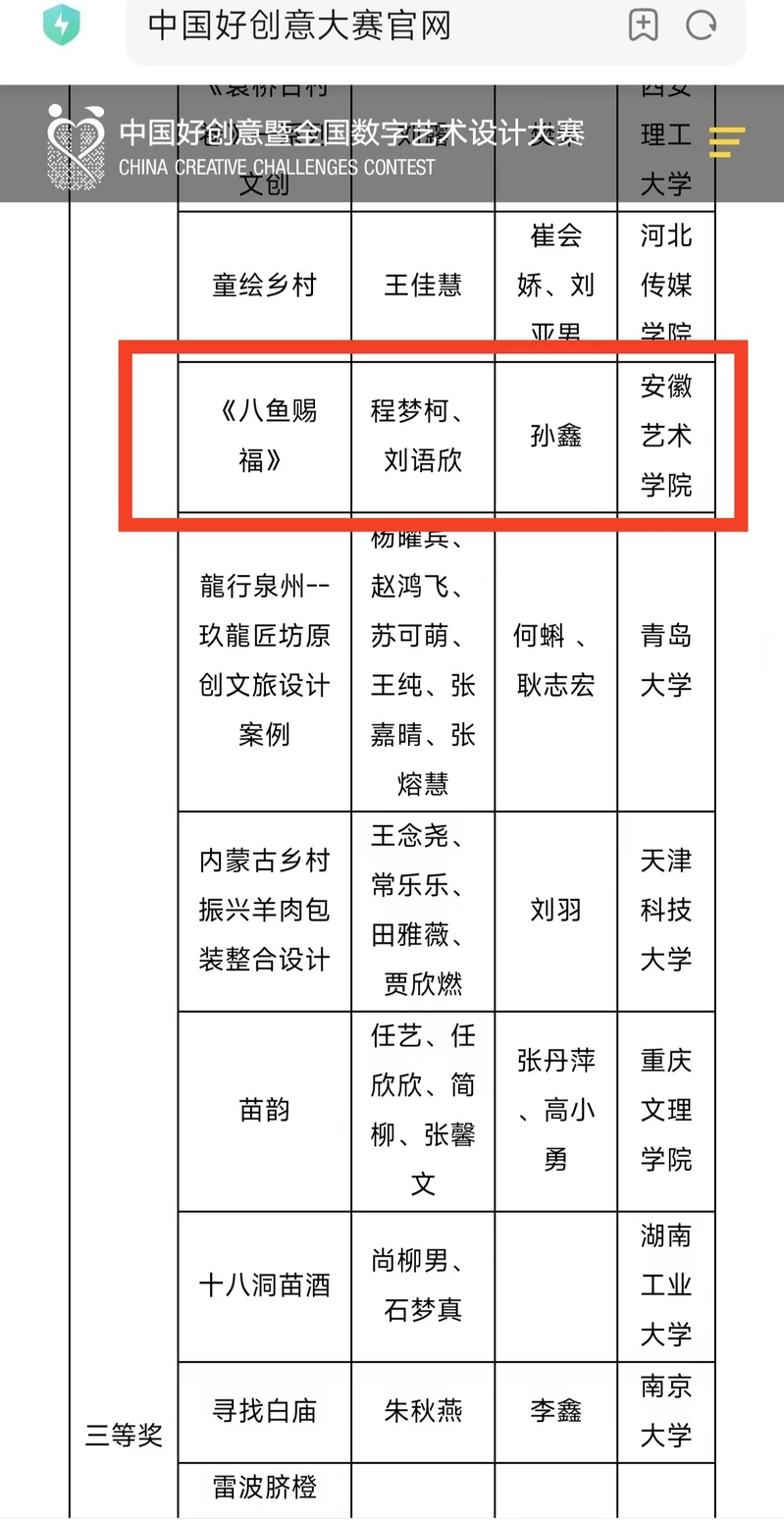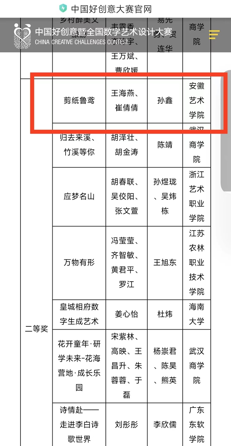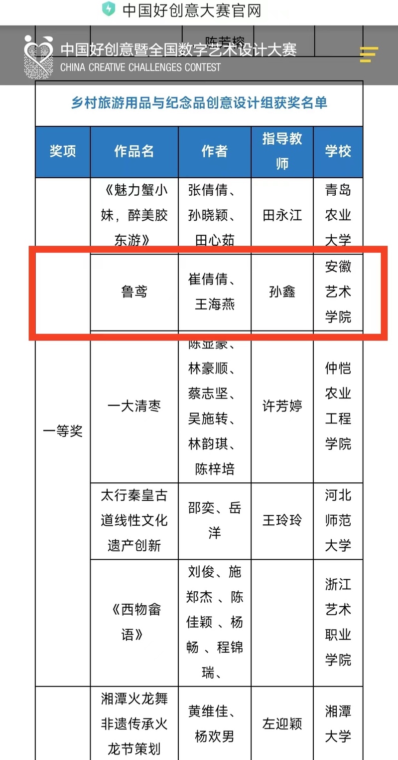 经过激烈的评选,我校陶宗华,刘婷婷,薛莲三位老师指导的23级数字媒体艺术学生钟学林,侯博洋,王瑞喆,李瑞雪,刘旖婕获得了乡村旅游新媒体传播作品设计组三等奖;孙鑫老师指导的21级数字媒体艺术学生崔倩倩、王海燕分别获得乡村旅游用品与纪念品创意设计组一等奖,乡村旅游新媒体传播作品设计组二等奖;21级数字媒体艺术学生程梦柯、刘语欣获得乡村旅游用品与纪念品创意设计组三等奖。