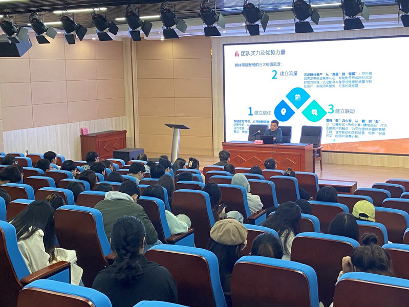 本次宣讲会特别邀请到了天地间博展科技安徽分公司总经理胡彪贤和广电矩阵传媒公司总经理陈军就实习单位的基本情况、就业前景和趋势、岗位需求等进行了介绍。