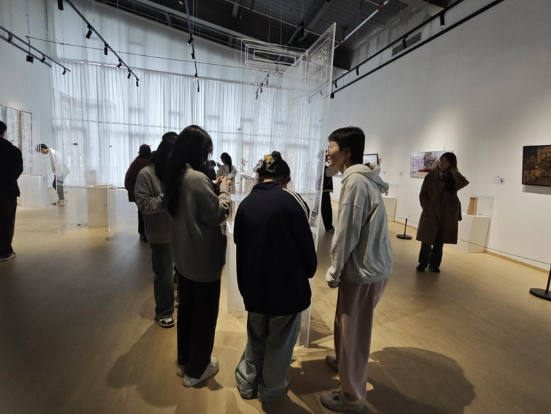 在辅导员吴又进老师的细致讲解下,学生们更加深入地了解了这些作品背后的传统技艺与艺术价值。艺术家们通过深入实践,不断探索如何将传统非遗材料的特性与现代生活场景相结合,展现了他们对新时代的深入思考与独到见解。这些作品不仅彰显了传统工艺在当代焕发的崭新风貌,更传递出艺术家们对传统文化的深厚情感与坚定守护。