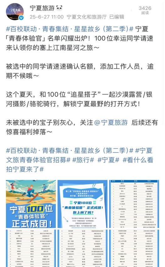 2025年7月,宁夏文旅“百校联动・青春集结・星星故乡(第二季)” 活动落下帷幕,100 位来自全国高校的大学生“青春体验官”完成了一场与宁夏星河的深度对话。