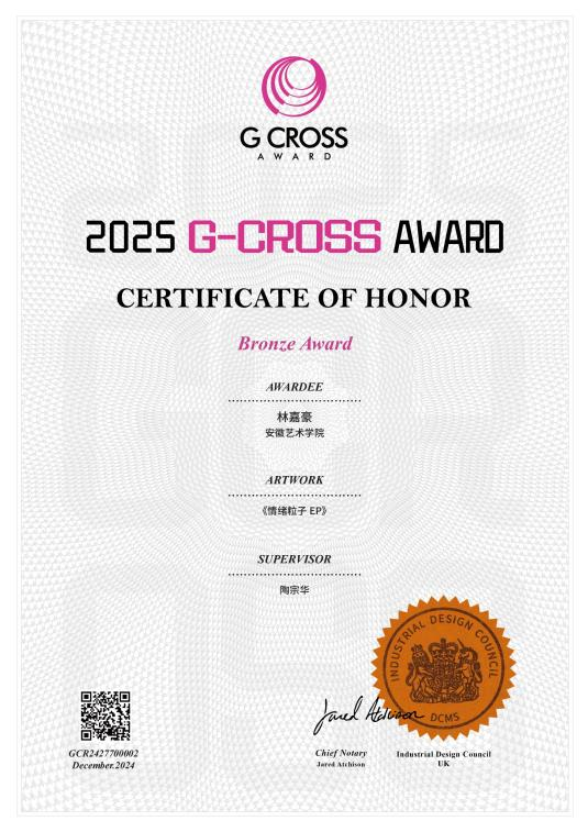 近日,由英国工业设计委员会主办,美国建筑师协会和英国南安普敦大学设计学院联合主办的国际赛事2025第五届 G-CROSS AWARD 创意奖,设计学院数字媒体艺术专业2022级林嘉豪同学作品《情绪粒子》获得铜奖,展现了安艺学子扎实的专业素养和良好的精神风貌。该赛...
