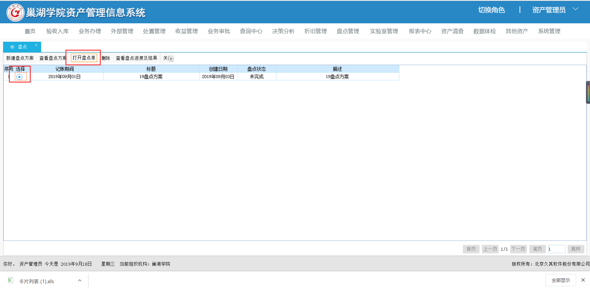 部门资产管理员登录资产系统后进入【盘点管理】-【资产盘点】选择对应盘点单,并点击【打开盘点单】按钮