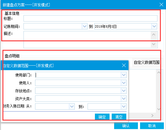 根据提示信息完成此次盘点信息的录入,通过记账日期以及自定义数据范围规定盘点范围,最终点击【确定】按钮,完成盘点方案的新建