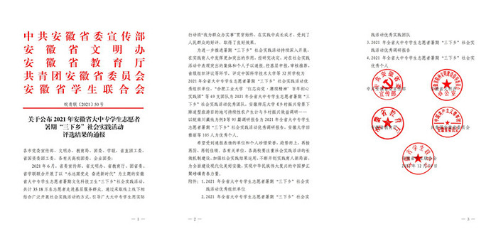 省委宣传部、省文明办、省教育厅、团省委和省学联联合发文,对我校在以“永远跟党走 奋进新时代”为主题的安徽省大中专学生志愿者暑期“三下乡”社会实践活动中的优异表现予以肯定。