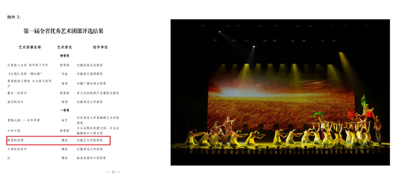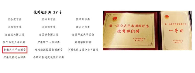 近日,共青团安徽省委通报第五届全省优秀微团课及第一届全省优秀艺术团课评选结果,我校选送的舞蹈《希望的田野》获第一届全省优秀艺术团课一等奖(全省共5个),学校团委荣获优秀组织奖。