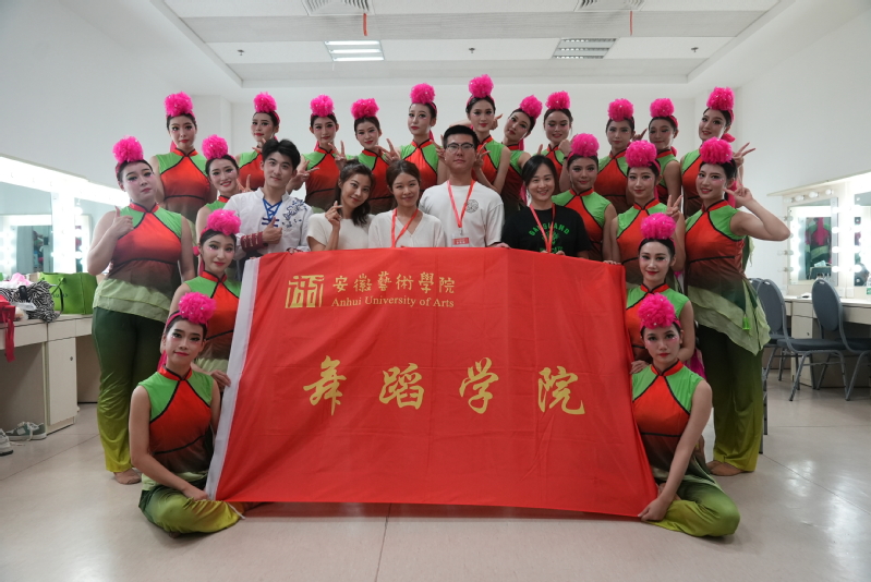 此次活动由舞蹈学院副院长李玉煜,舞蹈学院教师由曦、时特和吴艺璇带队,从教室排练到舞蹈呈现都非常顺利。舞蹈作品《花落花开》由21位舞蹈表演专业在校生共同完成。舞台上,同学们手持扇、头戴花,在伞头的带领下演绎着安徽花鼓灯的舞蹈魅力。出色的表演获得现场观众的一致好评。