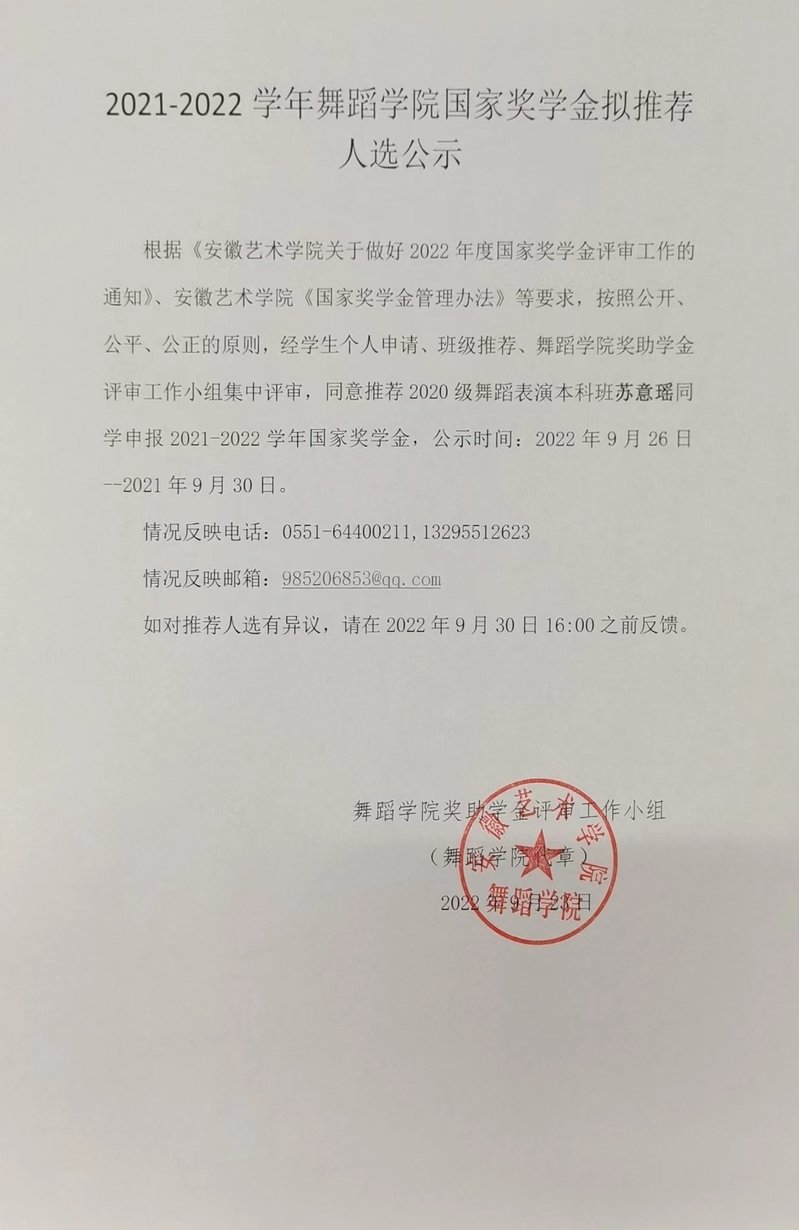 2021-2022学年舞蹈学院国家奖学金拟推荐人选公示