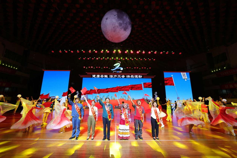 第三篇章“共铸辉煌之路”,从跟跑、并跑到领跑,江淮大地的劳动者以实干诠释使命,舞台上漫步遨游的太空人、手持航天模型探索的年轻人,映照着空天信息产业,从遥望星空,到安徽问天,表现了安徽职工在新时代下的奋斗与梦想。描绘了安徽在新中国成立75年来的辉煌成就。