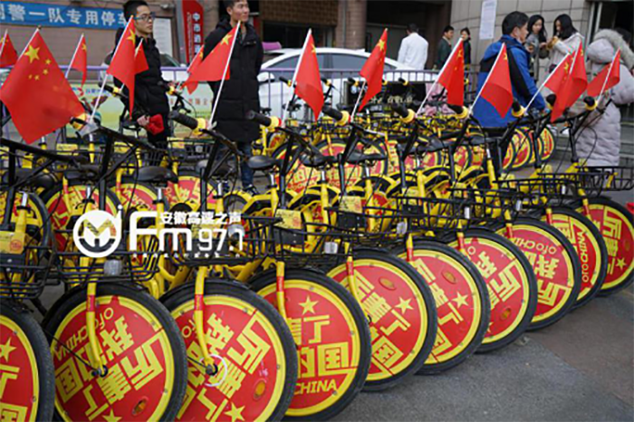 随着音乐响起,学生党员们骑着19辆代表共享理念的小黄车,次第出发,最后同等间距定位在广场的最外围。车头上插着国旗,小黄车更是用自己的“身躯”,说出了大家心底的话——“厉害了我的国”;而19辆小黄车,代表着庆祝2017年十九大的成功举办。19位学生党员旗手,随着音乐在歌声中挥动着手中的国旗,一起激情饱满地合唱。