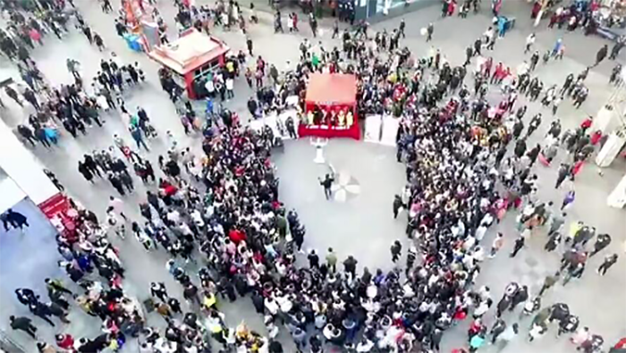 "五星红旗迎风飘扬,胜利歌声多么响亮,歌唱我们亲爱的祖国,从此走向繁荣富强……"。歌声刚落,在场的所有表演者迅速向四面八方散去,消失在人群中,现场鲜艳的巨幅党旗、国旗从高处展开,瞬间吸引所有人的目光,整个快闪活表演活动持续了大约15分钟。