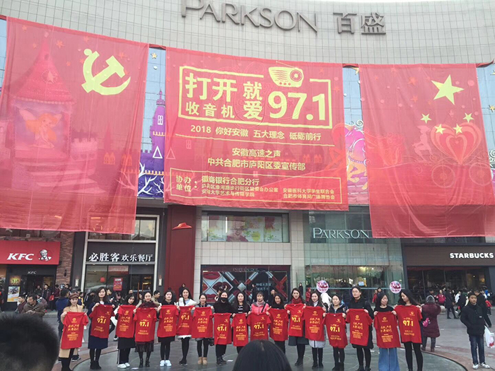 12月31日,由安徽高速之声、合肥市庐阳区委宣传部主办、安徽大学艺术与传媒学院协办的新年快闪活动在淮河路步行街欢快上演。我院新闻播音系全体学生党员和入党积极分子参与了此项活动。在2017年的最后一天,学生党员们以独特的创新意识,通过现场百人共舞、千人同唱的形式,歌唱祖国,致敬新时代。
