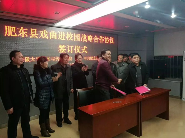 2月7日下午,学院与肥东县委宣传部“戏曲进校园”战略合作协议 签字仪式在肥东县广播电视大厦举行。学院党委书记、院长周之虎在副院长张晶及相关部门负责人的陪同下出席。肥东县委常委、宣传部部长许高彬以及相关单位负责人参加签约仪式。