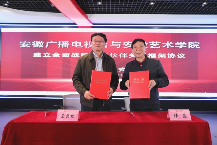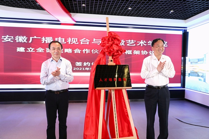 签约仪式上,张晶、王云松代表双方签订了校媒合作框架协议。周明洁、聂庆义为安徽广播电视台人才培养基地揭牌。