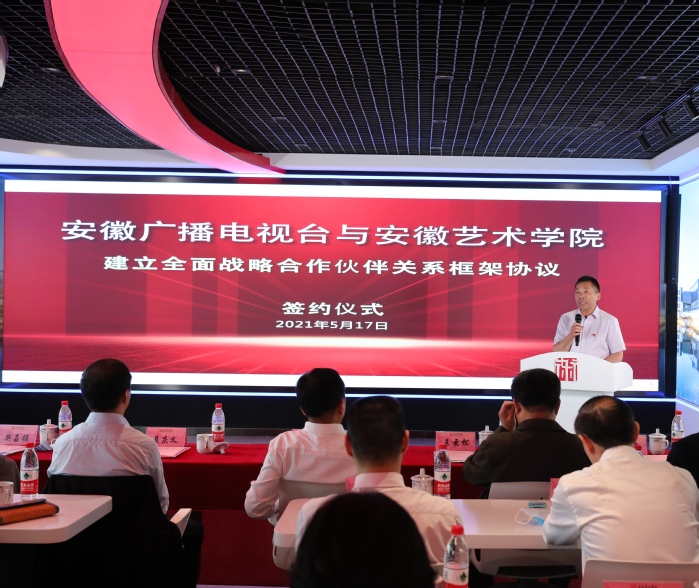 5月17日,我校与安徽广播电视台在校播音主持楼VR新媒体党员活动中心签署建立全面战略合作伙伴关系框架协议。双方将在人才培养、学科发展、科学研究、队伍建设、资源共享等方面开展全面、实质性合作。校党委书记周明洁,安徽广播电视台党委书记、台长、总编辑聂庆义,校党委副书记、院长樊嘉禄,党务负责人沈端良,行政负责人张晶,安徽广播电视台党委委员、副台长王云松以及双方相关部门负责人、安徽广播电视台播音员主持人代表参加了签约仪式。