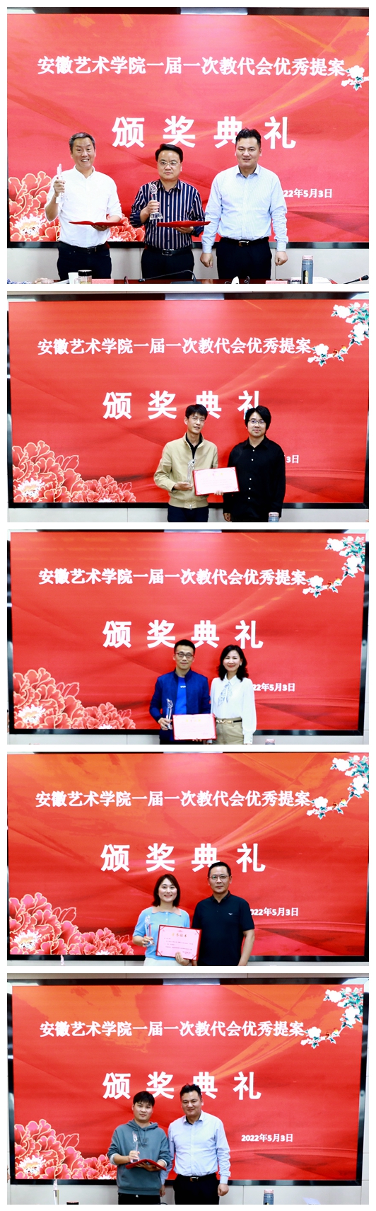 《关于住房货币化补贴的问题》《把马院作为重点学院、相关学科作为重点学科建设》《关于加强学院图书馆学科资源信息建设的建议》《关于遴选学生校长助理》《引进高级人才》《关于招聘专职党务工作人员、专职行政工作人员的问题》《我校专职辅导员编制问题解决》获评优秀提案。财务处、人事处、图书与信息中心获评提案办理先进单位。周明洁为提案办理先进单位颁发奖杯、证书,曹晓富、孙来法、王琍琍、李胜为优秀提案提案人颁发奖杯、证书。