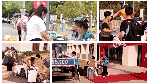青年志愿者协会志愿者和各二级学院志愿者在校门前帮助新生托运行李,为新生报到提供便利服务。他们引导新生有序到达各学院报到处,促进迎新工作快速高效完成。二级学院志愿者热情引导学生填写表格,发放校园卡。