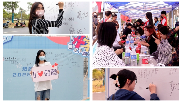 “亲爱的,热爱的,你是美院最爱的”“一见倾‘新’”“怦然‘新’动”“东方青苍,西方甩卖,传院迎新”等创意标语使迎新工作充满乐趣。校融媒体中心和各二级学院分别设立签名打卡墙,给迎新工作增添了满满的仪式感。