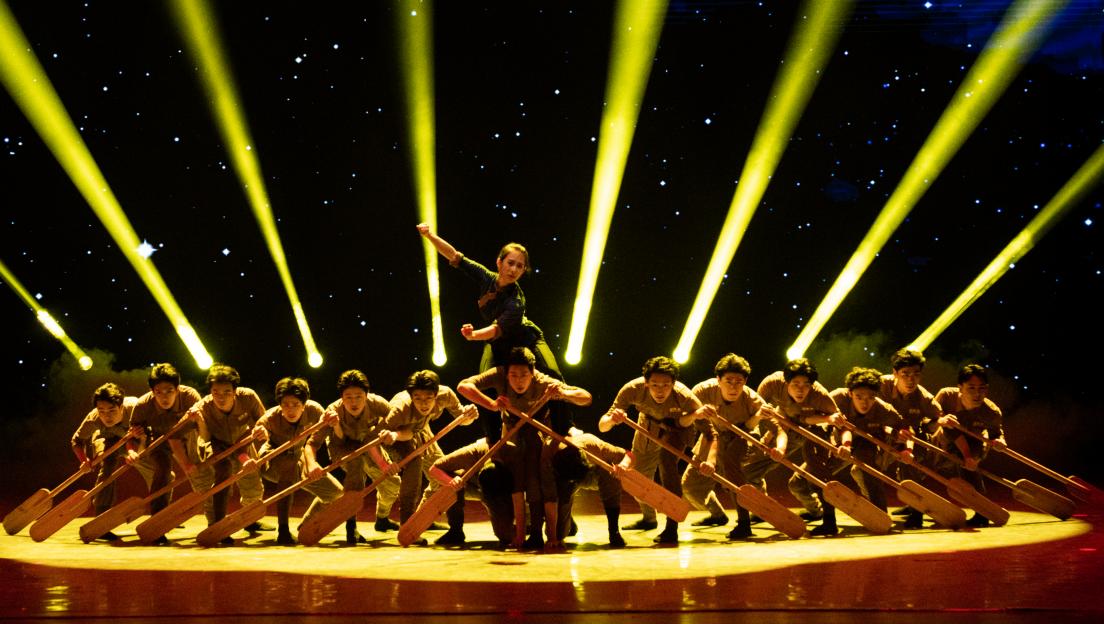 安徽艺术职业学院带来的群舞《渡江》,还原了年仅14岁的安徽渡江英雄“马毛姐”在渡江战役中不畏生死,多次运送解放军横渡长江的事迹,通过集体的力量展现出“百万雄师过大江”的壮观景象。