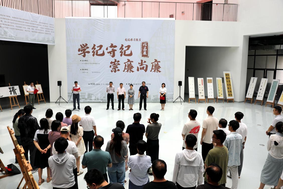 校党委委员、纪委书记程宗林指出,在党纪学习教育持续纵深推进之际,学校将“实”的要求贯穿始终。今天我们相聚在美术馆,共同庆祝党的生日,美术学院结合专业特色的艺术作品展,营造良好的学术氛围,是提升学习实效的重要载体。展览与时俱进地贯彻学校“党建强基年”要求,作品艺术化诠释了党规党纪,把百年党史、红色基因,与“德艺双馨、知行合一”的校训精神相融相合。他强调,各单位要把党纪学习教育作为一项长期的政治任务,分层分类的推进学习指导,将“学纪知纪、崇廉尚廉”意识贯彻到工作学习的方方面面,讲好“清廉安艺”故事,为学校高质量发展提供更加坚强的纪律保障。