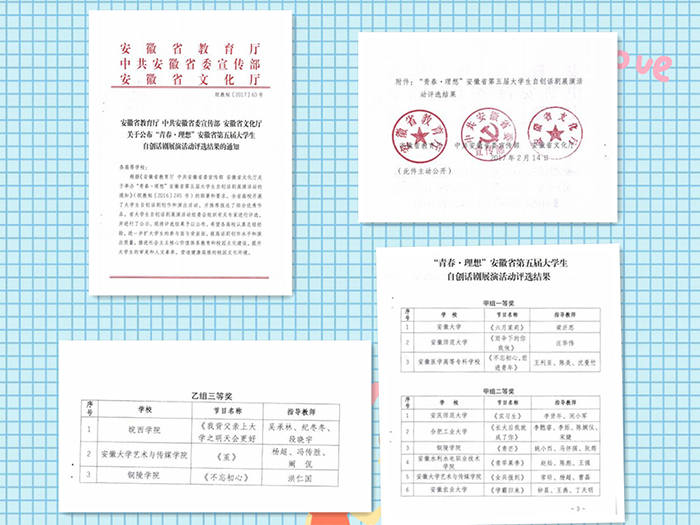 根据皖教秘〔2017〕63号文件精神,我院戏剧影视系教师常昕、杨超、冯传胜、曹磊、阚侃指导的原创话剧《女兵报到》、《茧》分获由安徽省教育厅、中共安徽省委宣传部、安徽省文化厅联合主办的“青春·理想”安徽省第五届大学生自创话剧展演活动甲组二等奖和乙组三等奖。