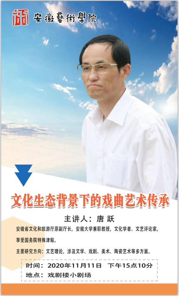 2020年11月11日下午15点10分,安徽省文化和旅游厅原副厅长,安徽大学兼职教授,文化学者、文学评论家唐跃受邀赴我系进行讲座,请全系教师、无课学生到场参加。