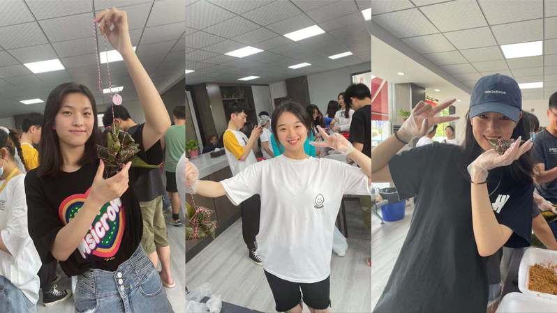活动开始,同学们在签到处领取了端午特别香囊,同学随机分为3个小组,组内自行协作分工包粽子。原材料都已备好,除了粽叶,还有糯米、五花肉等食材供同学们选取。在包粽子的过程中,有的同学技能熟练,很快就包好了外表美观的粽子;有的同学因为是第一次体验这样的活动,对如何包粽子的问题摸不清头脑,但是通过求助其他同学,较快地包好了粽子。“包粽子看上去挺容易,做起来还是有点难度的。”吴思颖一边包粽子,一边告诉老师们。“以前端午节都是和父母在家包粽子,今年虽然端午不能和家人度过,在学校自己尝试包粽子也是不错的节日体验,我要多包几个粽子给我室友尝尝。”黄雪一边包一边向老师展示自己的劳动成果。