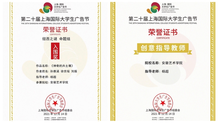 据了解,第20届上海国际大学生广告节收到来自全国近五百所高校共计上万份创意作品,入围名额仅为全国前两百名。我校学生作品从海内外上万条作品中脱颖而出、成功入围,指导教师杨超获创意指导教师荣誉。