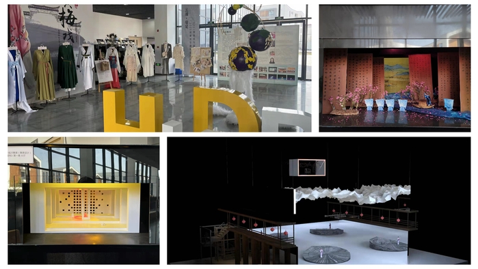 本次展览,从制作到布展均由学生在教师指导下自主完成。展览以网络为媒介,以“云端—驻足”为主题,致力于探索重德文化价值观下舞台空间的体现,彰显古皖戏剧风采。现场展出的作品包括《哈姆雷特》《孔雀东南飞》《图兰朵》等镜框式舞台模型,玉屏风、青铜编钟、铜锁、箭符等舞台道具,凤冠、团扇、绒花等人物造型头饰,《合柴1972》等情景模型,《暗恋桃花源》等舞台服装。作品涵盖了话剧、戏曲、歌剧等多种类型,内容丰富、形式多样。除了手工制作作品,部分展示还运用了3D打印技术。