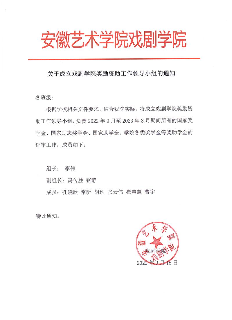 2022年戏剧学院成立或调整学生资助工作领导小组的通知