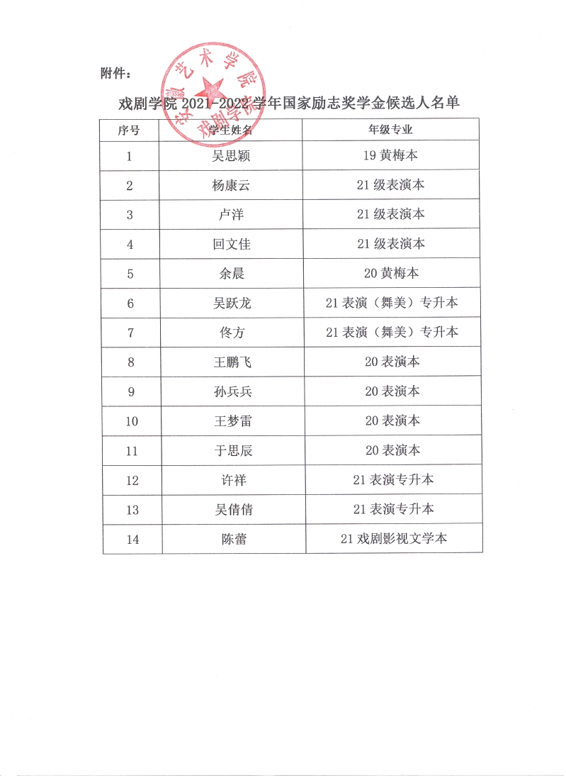 戏剧学院2021-2022学年国家励志奖学金拟推荐人选公示