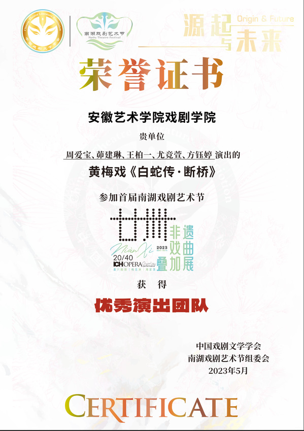 5月29日,2023南湖戏剧艺术节“廿卌非遗戏曲叠加展”评选结果揭晓,乐动网官网戏剧学院黄梅戏《白蛇传·断桥》团队荣获优秀演出团队奖。