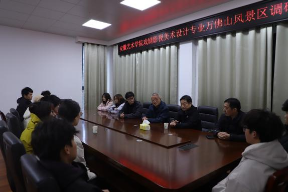 此次实践调研活动,由戏剧影视美术设计教研室负责人申林松与青年教师罗浩林、汪宇、孙禹共同参与。抵达万佛山后,风景区总负责人与各位老师、同学代表开展座谈会,并于次日上午对万佛山、舒城县委大院等地进行实地调研。