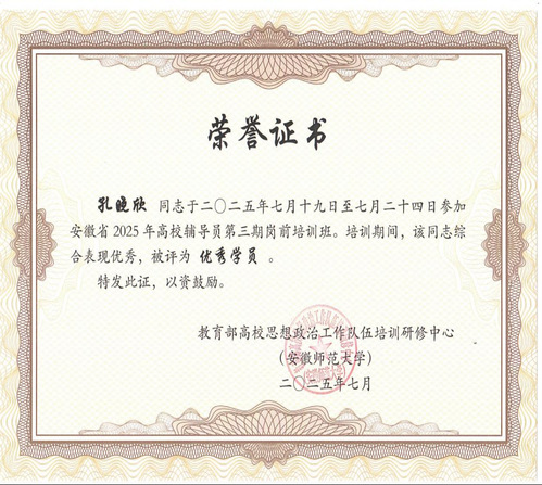 同时,作为组长代表,结合我院工作实际,在总结会上分享了我院学生工作的特色做法与成功案例,引发各高校参训人员共鸣,有效推动了我院学工经验与兄弟院校的交流互鉴。凭借优异表现,孔晓欣荣获“优秀学员”称号。
