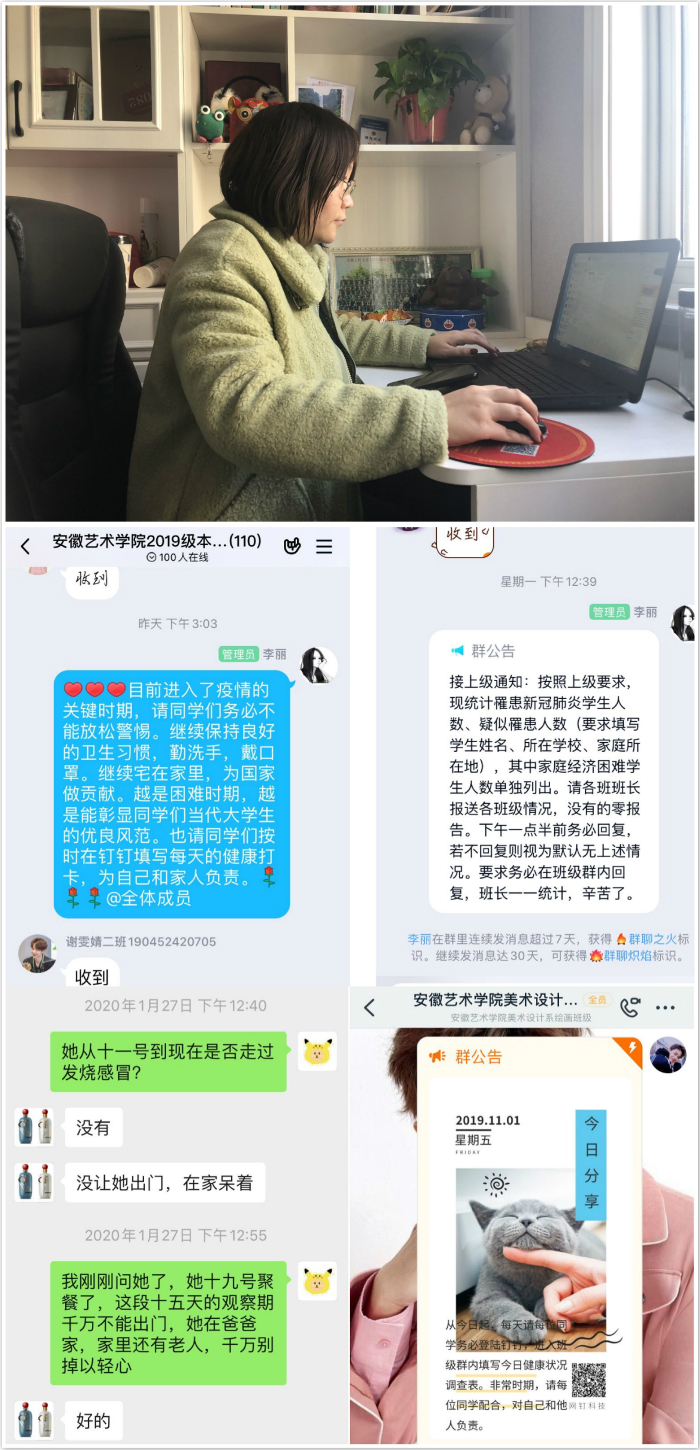 自新冠肺炎发生以来,虽是新入职辅导员,但具有疫情敏锐性的美术设计系辅导员李丽,迅速从“休假”模式切换到“战时”模式,严格落实疫情防控责任,做到守土尽责。