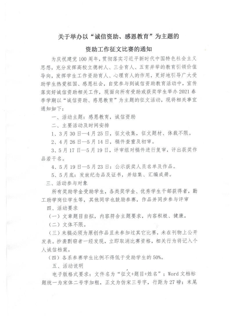 关于举办以“诚信资助、感恩教育”为主题的资助工作征文比赛的通知