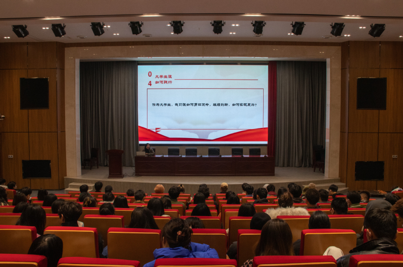 12月22日,辅导员讲师团成员、新闻播音系学生管理办公室主任陈伟伟慷慨激昂的宣讲,赢得了现场200多名同学的掌声。